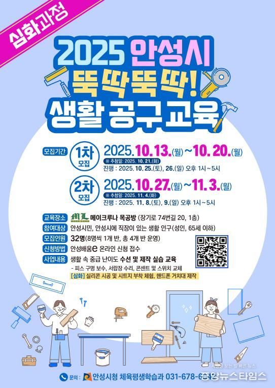 (중앙뉴스타임스 = 방재영 기자) 안성시는 시민들의 생활 자립 역량 강화를 위해 '뚝딱뚝딱 생활 공구[심화과정] 교육'을 오는 25~26일과 11월 8~9일, 총 2회 주말 일정으로 운영한다고 13일 밝혔다.
