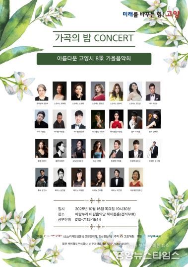 (중앙뉴스타임스 = 이광운 기자) 고양특례시가 후원하고, (사)한국예술문화단체총연합회 고양지회가 주최하며 (사)한국음악협회 고양지부가 주관하는 ‘2025 가곡의 밤 – 아름다운 고양시 8경(景) 가을 음악회’가 오는 16일 오후 7시 30분, 고양아람누리 아람음악당에서 개최된다.
