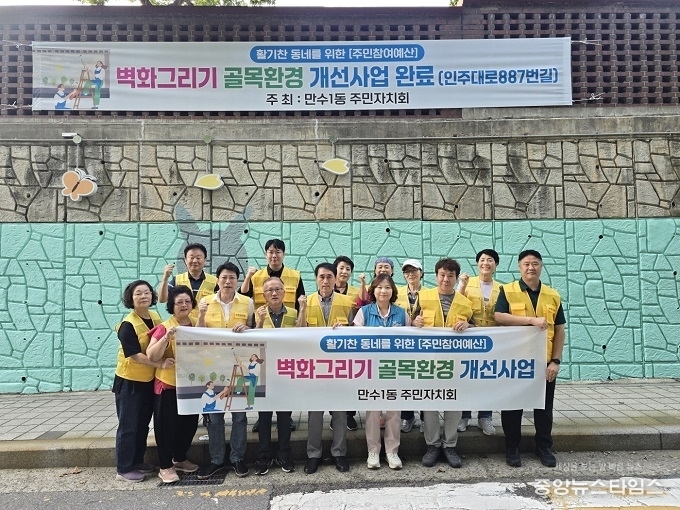 (중앙뉴스타임스 = 방재영 기자) 인천 남동구 만수1동 행정복지센터는 최근 주민자치회가 마을환경 개선을 위해 건설기술교육원(인주대로 887번길) 옹벽에 벽화 거리를 조성했다고 13일 밝혔다.