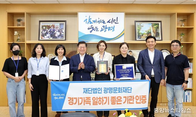 (중앙뉴스타임스 = 이광운 기자) (재)광명문화재단은 가족친화적인 조직문화 조성과 복지 제도 운영의 우수성을 인정받아, 경기도로부터 ‘2025년 가족친화 일하기 좋은 기업’ 인증을 받았다.