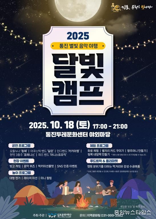 (중앙뉴스타임스 = 이광운 기자) (재)김포문화재단이 주관하는 2025 통진별빛음악야행 '달빛캠프'가 10월 18일 17시부터 통진두레문화센터 야외마당에서 개최된다.