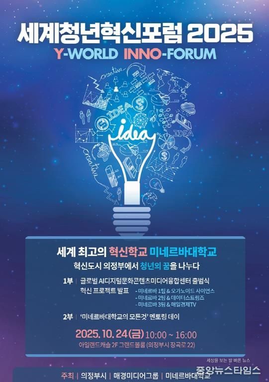 (중앙뉴스타임스 = 방재영 기자) 의정부시는 오는 24일 오전 10시, 아일랜드캐슬 2층 그랜드볼룸에서 ‘세계청년혁신포럼 2025(Y-WORLD INNO-FORUM)’를 개최한다.