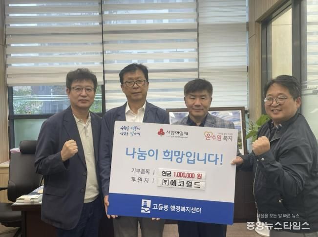 (중앙뉴스타임스 = 방재영 기자) 수원시 팔달구 고등동은 10월 13일, 사회적기업 ㈜에코월드로부터 관내 취약계층을 위한 이웃돕기 성금 100만원을 전달받았다고 밝혔다.