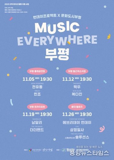 (중앙뉴스타임스 = 방재영 기자) 인천 부평구 문화재단 문화도시센터는 오는 11월 매주 수요일 오후 7시 30분 지역 뮤지션들의 공연 ‘MUSIC EVERYWHERE 부평’을 총 4회에 걸쳐 진행한다고 14일 밝혔다.