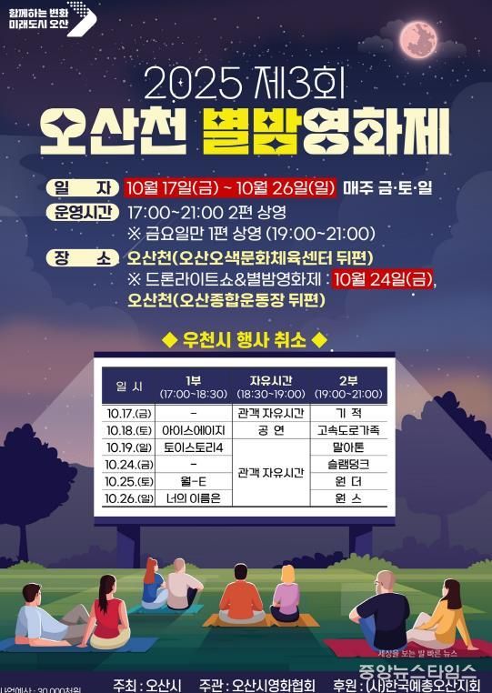 (중앙뉴스타임스 = 이광운 기자) 오산시는 오는 10월 17일부터 26일까지 매주 금·토·일 저녁, 오산천(오색문화체육센터 뒤편)에서 시민들이 야외에서 영화를 즐길 수 있는 '2025 제3회 오산천 별밤영화제'를 개최한다고 밝혔다.