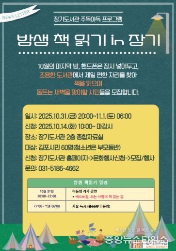 (중앙뉴스타임스 = 이광운 기자) 김포시 장기도서관은 주독야독 프로그램인 '밤샘 책 읽기 인(in) 장기'를 10월 31일 오후 8시부터 11월 1일 오전 6시까지 장기도서관에서 진행한다고 밝혔다.