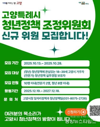 (중앙뉴스타임스 = 방재영 기자) 고양특례시는 청년이 시정의 주체로 참여해 정책을 함께 만들어갈 수 있도록 고양시 청년정책조정위원회 청년 및 전문가 위원을 공개 모집한다고 밝혔다.