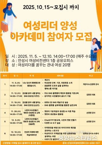 (중앙뉴스타임스 = 방재영 기자) 안성시는 지역사회 발전을 이끌 열정있고 능력있는 여성 지도자를 발굴·육성하기 위해 ‘2025년 안성시 여성리더 양성 아카데미’ 기본과정 교육 참가자를 모집한다고 15일 밝혔다.