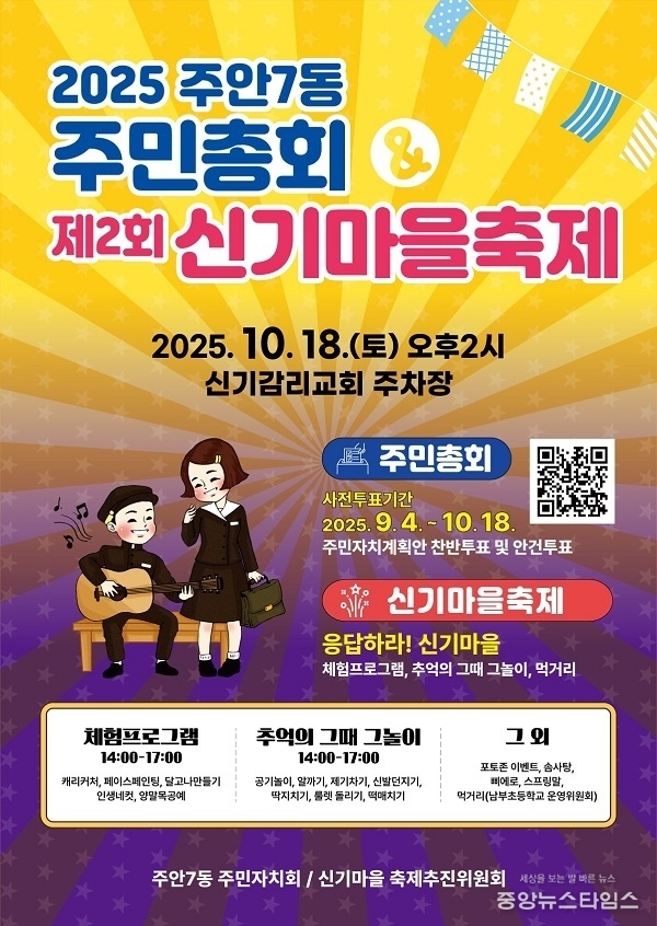 (중앙뉴스타임스 = 방재영 기자) 인천 미추홀구 주안7동 주민자치회(회장 송정흠)는 오는 18일 신기감리교회에서 ‘주안7동 주민총회 및 제2회 신기마을 축제’를 개최한다.