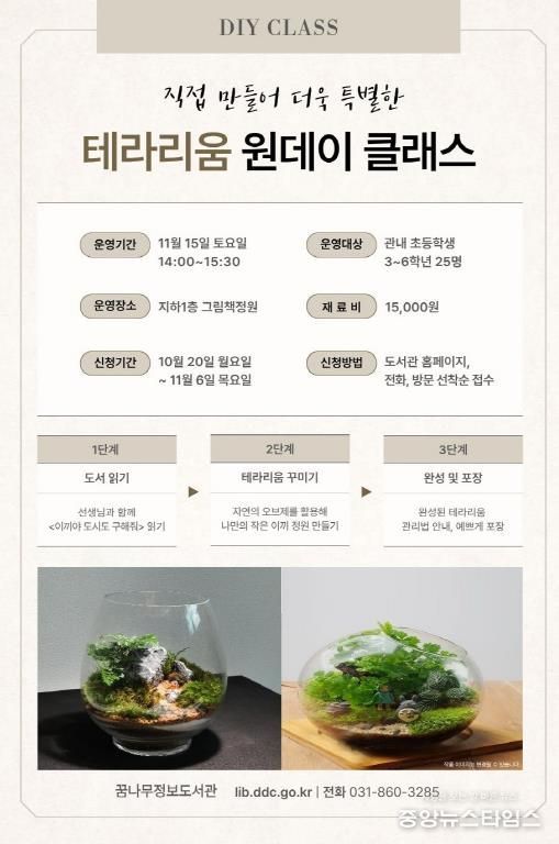 (중앙뉴스타임스 = 방재영 기자) 동두천시 도서문화사업소 꿈나무정보도서관은 오는 10월 20일부터 초등학교 3~6학년을 대상으로 『테라리움 만들기』 원데이 클래스를 운영한다고 밝혔다.