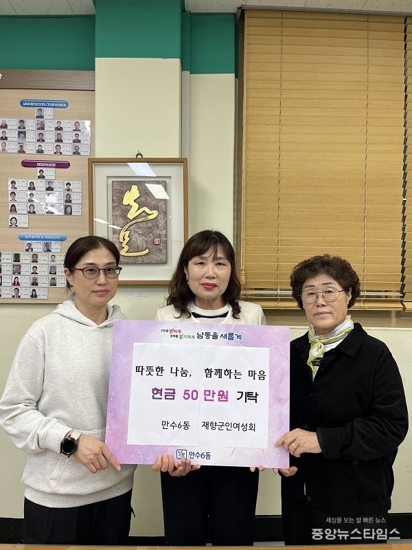 (중앙뉴스타임스 = 방재영 기자) 인천 남동구 만수6동 행정복지센터는 만수6동 재향군인여성회(회장 이순남)에서 추석 명절을 맞아 진행한 송편 및 가래떡 판매 수익금 50만 원을 어려운 이웃을 위해 기부했다고 16일 밝혔다.