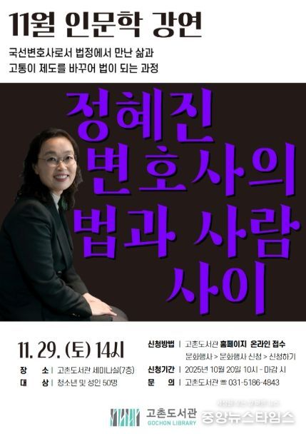 (중앙뉴스타임스 = 이광운 기자) 김포시 고촌도서관은 오는 11월 29일 오후 2시부터 4시까지 '법과 사람 사이' 강연을 운영한다.
