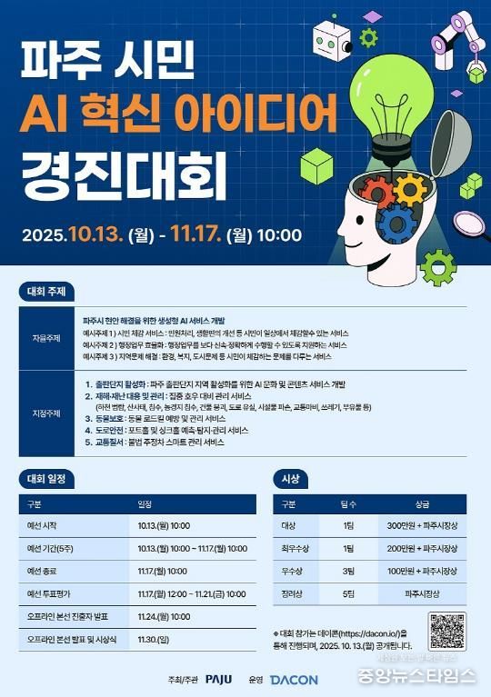 (중앙뉴스타임스 = 이광운 기자) 파주시는 오는 11월 17일까지 시민이 직접 참여하는 ‘파주 시민 인공지능(AI) 혁신 아이디어 경진대회’를 개최한다고 17일 밝혔다.
