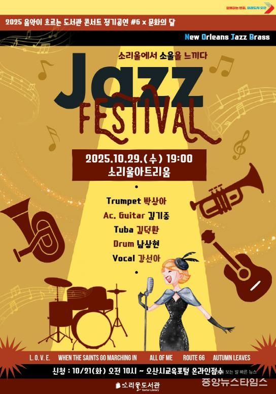 (중앙뉴스타임스 = 이광운 기자) 경기 오산시는 오는 29일 오후 7시, 소리울도서관 3층 소리울아트리움에서 '2025 음악이 흐르는 도서관 콘서트 정기공연 #6 × 문화의 달 – Jazz Festival; 소리울에서 소울을 느끼다'를 개최한다고 17일 밝혔다.