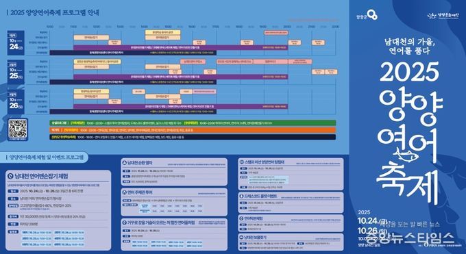 (중앙뉴스타임스 = 방재영 기자) 가을의 생명력과 생태의 순환을 주제로 한 ‘2025 양양연어축제’가 오는 10월 24일부터 26일까지 3일간 양양읍 남대천 둔치 일원에서 개최된다.