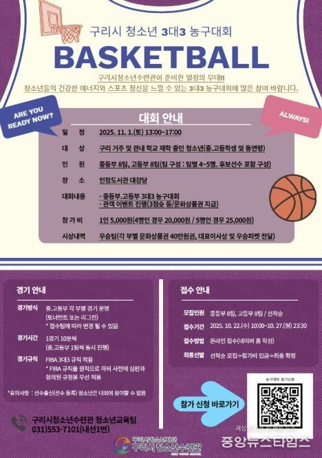 (중앙뉴스타임스 = 방재영 기자) 구리시청소년재단 청소년수련관은 '2025 구리시 청소년 3대3 농구대회' 참가 신청을 오는 22일부터 27일까지 온라인으로 신청받는다고 20일 밝혔다.