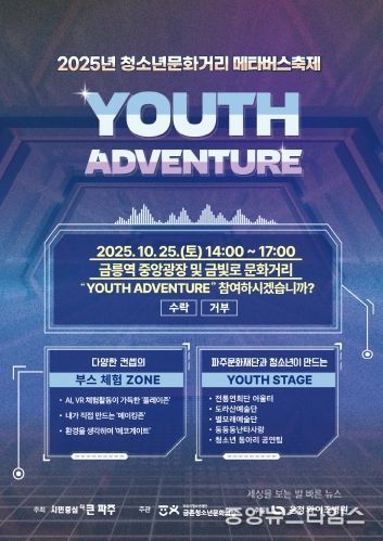 (중앙뉴스타임스 = 이광운 기자) (재)파주시청소년재단 금촌청소년문화의집은 오는 2025년 10월 25일 토요일 금릉역 중앙광 및 금빛로 문화거리 일대에서 2025년 청소년문화거리메타버스축제 ‘YOUTH ADVENTURE’를 개최한다고 밝혔다.