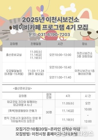 (중앙뉴스타임스 = 방재영 기자) 이천시는 임산부 및 6개월~15개월 영아의 보호자를 대상으로 20일부터 ‘베이비카페 프로그램 4기’ 대상자를 선착순으로 모집 중이다. 온라인 신청(이천시청 누리집-교육포털-교육 강좌 신청)을 통해 선착순으로 접수하며 오감 발달 놀이의 경우 각 12명씩을 모집한다.