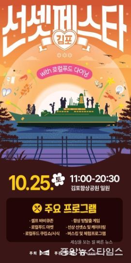 시 관계자는 “김포 선셋 페스타는 함상 석양을 배경으로 로컬푸드 미식과 문화 콘텐츠가 어우러지는 색다른 축제”라며 “안전하고 쾌적한 환경에서 시민과 관광객 모두에게 잊지 못할 경험을 제공하겠다”고 말했다.