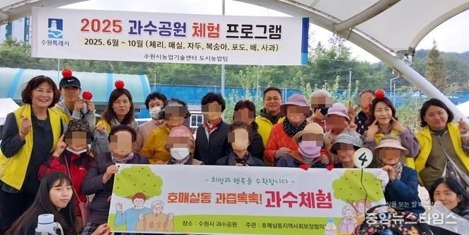 (중앙뉴스타임스 = 방재영 기자) 수원시 권선구 호매실동 지역사회보장협의체는 지난 20일 저소득 홀몸 어르신들을 모시고 과수 체험(사과 따기)에 나섰다. 이번 행사는 관내 홀몸 어르신들의 우울감 등을 예방하고 사회적 관계망을 만들기 위해 진행됐다.