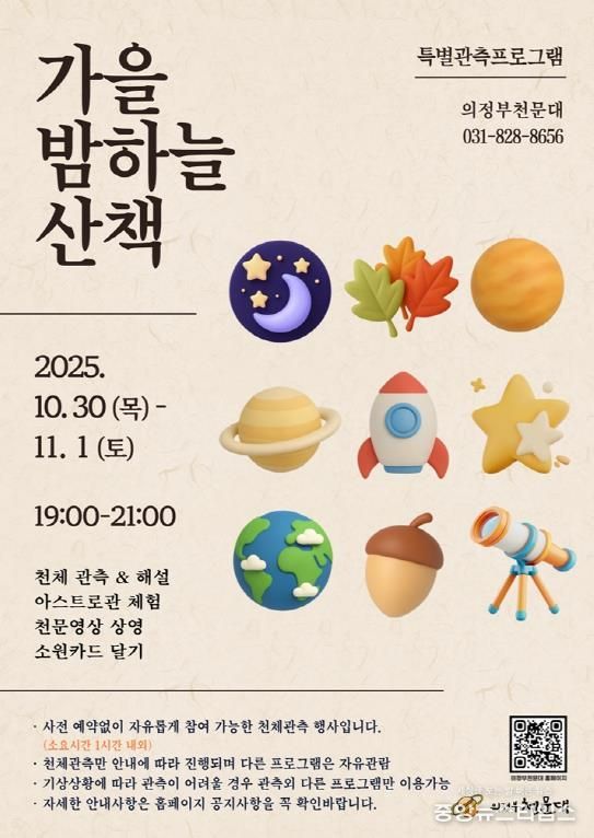 (중앙뉴스타임스 = 방재영 기자) 의정부과학도서관은 오는 30일부터 11월 1일까지 의정부천문대에서 특별 관측 행사 ‘가을 밤하늘 산책’을 운영한다고 21일 밝혔다.