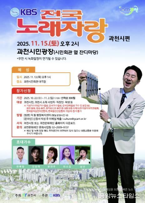 (중앙뉴스타임스 = 이광운 기자) 과천시는 대한민국 대표 장수 프로그램 KBS1TV ‘전국노래자랑’이 오는 11월 15일, 과천시민광장에서 공개녹화를 진행한다고 밝혔다. 이번 행사는 7년 만에 과천에서 열려, 시민들에게 특별한 추억을 선사할 것으로 기대된다.
