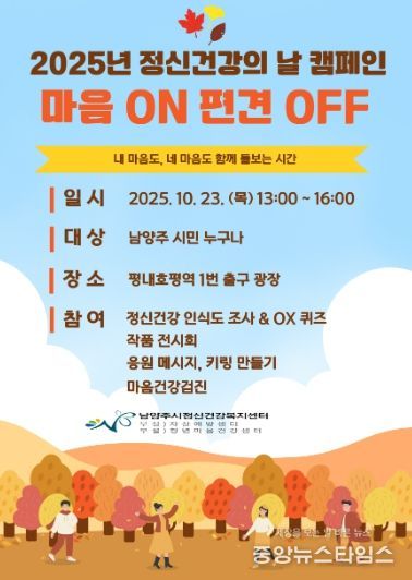 (중앙뉴스타임스 = 방재영 기자) 남양주시는 오는 23일 오후 1시 평내호평역 1번 출구 광장 일원에서 ‘정신건강의 날’을 기념해 정신건강 인식 개선 및 편견 해소를 위한 연합캠페인 ‘마음 ON, 편견 OFF’를 진행한다고 21일 밝혔다.