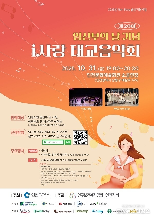 ‘i사랑 태교음악회’는 인천시가 주최하고 인구보건복지협회 인천지회가 주관하여 임신과 출산의 중요성을 알리고 임산부 배려 문화를 조성하기 위한 취지로 마련됐다. ‘아이&i 임산부 합창단’과 ‘i-신포니에타’가 함께하는 아름다운 공연을 통해 임산부와 가족들에게 힐링의 시간을 선사할 예정이다.