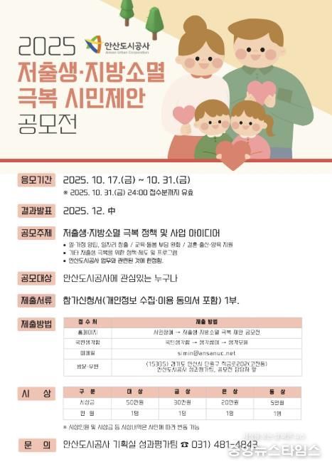 (중앙뉴스타임스 = 방재영 기자) 안산도시공사는 ‘2025년 저출생지방소멸 극복 시민제안 공모전’을 열고 시민과 함께 인구문제 극복방안을 모색하고 시민 체감형 정책·사업 발굴에 나선다고 22일 밝혔다.