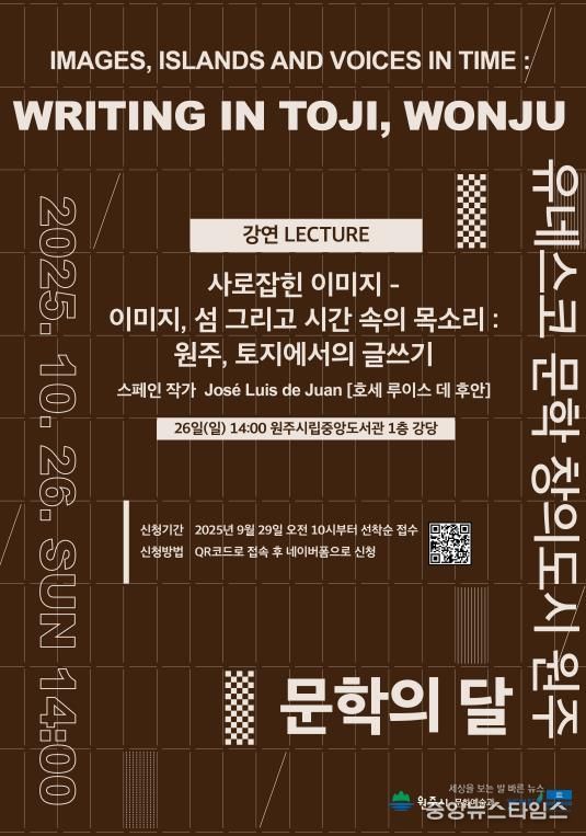 이번 강연은 ‘Images, islands and voices in time: writing in Toji, Wonju(이미지, 섬 그리고 시간 속의 목소리: 원주, 토지에서의 글쓰기)’를 주제로, 작가가 원주에서 집필하며 느낀 한국의 문학적 풍경과 예술적 영감을 공유하는 자리다. 문학을 통해 세계와 지역이 소통하는 유네스코 창의도시의 정체성을 보여주는 ‘2025 원주 문학의 달’의 뜻깊은 기념행사로 마련됐다.