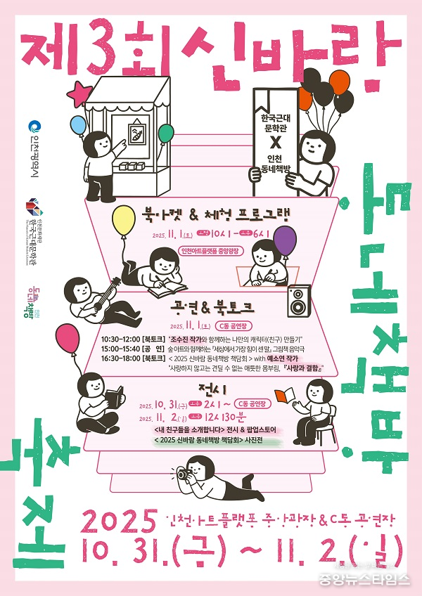 (중앙뉴스타임스 = 방재영 기자) 인천문화재단 한국근대문학관은 오는 31일부터 11월 2일까지 인천아트플랫폼 중앙광장과 C동 공연장에서 ‘2025 신바람 동네책방 축제’를 개최한다고 23일 밝혔다.