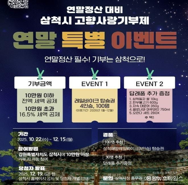 (중앙뉴스타임스 = 방재영 기자) 삼척시는 연말정산 기간을 앞두고 '연말정산 대비 삼척시 고향사랑기부제 연말 특별 이벤트'를 진행한다고 24일 밝혔다.