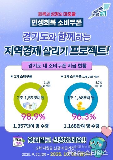 한편 경기도의 지난 1차 소비쿠폰의 지급률은 98.9%로 1,357만여 명이 소비쿠폰 2조 1,593억 원을 수령한 바 있으며, 26일 현재 1차와 2차를 거쳐 지급된 소비쿠폰(약 3조 3,275억 원)의 91.5%가 사용된 것으로 나타났다.