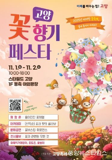 (중앙뉴스타임스 = 이광운 기자) 고양특례시는 오는 11월 1일과 11월 2일, 오전 10시부터 오후 6시까지, 스타필드 고양 1층 동측 야외광장에서 2025년 마지막 꽃축제인 ‘고양 꽃향기 페스타’를 개최한다고 밝혔다.