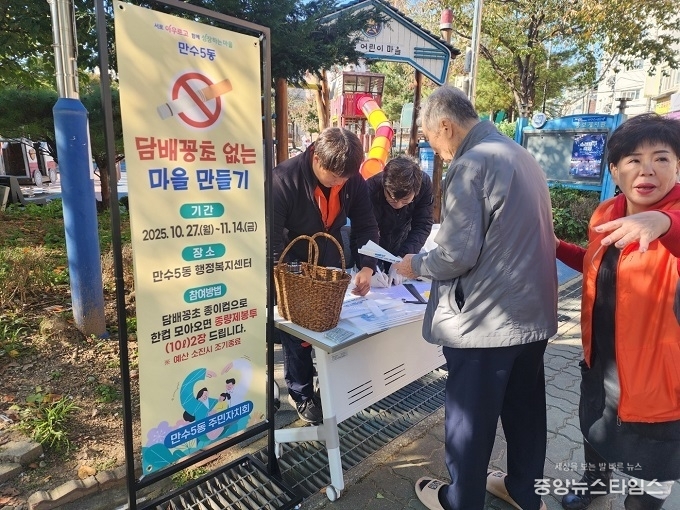 (중앙뉴스타임스 = 방재영 기자) 인천 남동구 만수5동 주민자치회(회장 윤덕중)는 27일부터 11월 14일까지 ‘담배꽁초 없는 마을 만들기’ 사업을 추진하며 주민이 함께하는 환경정화 활동에 나섰다고 29일 전했다.