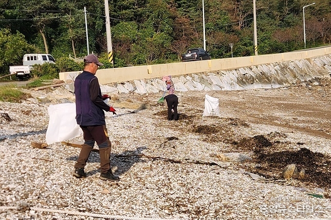 이번 행사에 참여한 면사무소 직원, 일자리 참여자 등 약 20여 명은 오전 9시부터 시작해 1시간 동안 바닷가에 떠밀려온 각종 해안쓰레기를 수거했다.