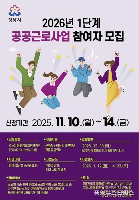 (중앙뉴스타임스 = 방재영 기자) 성남시는 오는 10일부터 14일까지 ‘2026년도 1단계 공공근로사업’ 참여 희망자 465명을 모집한다고 3일 밝혔다.
