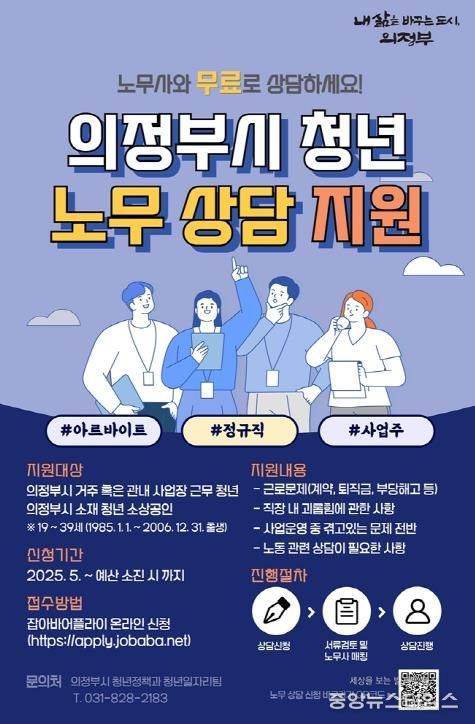 (중앙뉴스타임스 = 방재영 기자) 의정부시는 청년들의 근로권익 보호와 건강한 노동환경 조성을 위해 ‘찾아가는 청년 노무사 상담'을 운영한다고 3일 밝혔다.