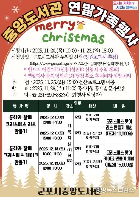 (중앙뉴스타임스 = 방재영 기자) 군포시 중앙도서관은 연말을 맞아 도서관이 시민들에게 더욱 친근한 문화공간이 되어 가족 간의 따뜻한 추억을 쌓게 하고자 연말가족행사를 마련했다.