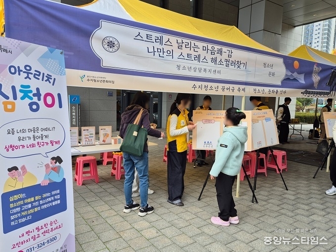 (중앙뉴스타임스 = 방재영 기자) 용인시청소년미래재단 청소년상담복지센터는 지난 8일 수지구청 어울림 광장에서 열린 2025 수지꿈머굼 청소년축제 ’청소년, 문화를 잇다’ 현장에서 제10차 아웃리치 ‘스트레스 날리는 마음 쾌-감!’ 체험부스를 운영하며 청소년과 시민들의 큰 호응을 얻었다.