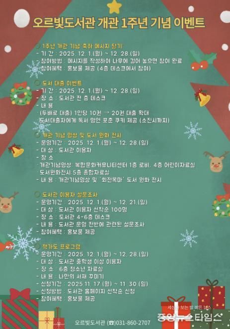 (중앙뉴스타임스 = 김수진 기자) 동두천시 오르빛도서관이 개관 1주년을 맞아 12월 한 달간 다채로운 문화행사를 진행한다. 오르빛도서관은 지난해 12월 개관 이후 시민들의 높은 관심 속에 지역 대표 독서문화 공간으로 자리매김해왔다.