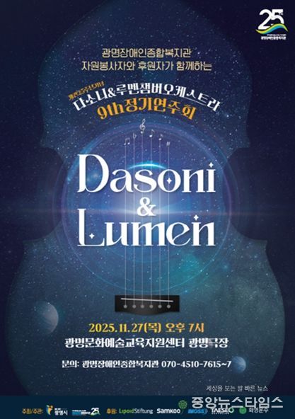(중앙뉴스타임스 = 방재영 기자) 광명장애인종합복지관은 개관 25주년을 맞아 오는 11월 27일 오후 7시, 광명극장에서 ‘다소니&루멘챔버오케스트라 제9회 정기연주회’를 개최한다. 이번 연주회는 복지관을 위해 꾸준히 후원과 자원봉사를 실천해온 후원자와 자원봉사자를 초청해, 장애인 예술가의 무대를 함께 즐기는 감사의 자리로 마련됐다. 복지관은 이번 행사를 통해 지역사회가 장애예술을 보다 가까이 경험하고, 문화예술을 매개로 한 긍정적 인식 변화가 확산되기를 기대하고 있다.