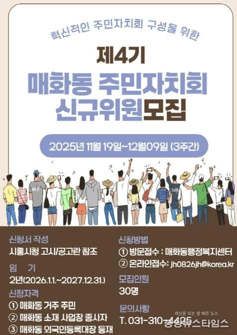 (중앙뉴스타임스 = 방재영 기자) 시흥시 매화동 행정복지센터는 12월 9일까지 ‘제4기 매화동 주민자치회’ 신규위원 30명을 공개 모집한다. 신청은 매화동 행정복지센터 방문 또는 전자우편을 통해 가능하다.