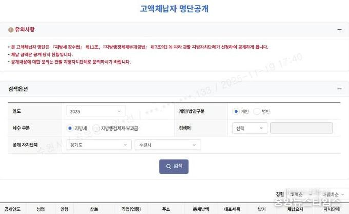 고액·상습체납자 명단은 수원시 홈페이지'분야별정보'세금'정보마당'‘고액 상습체납자 공개’ 게시판에서 확인할 수 있다.