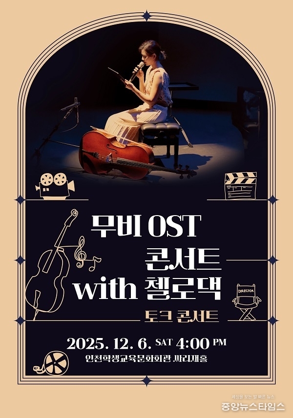 (중앙뉴스타임스 = 방재영 기자) 인천시교육청학생교육문화회관에서는 오는 12월 6일 오후 4시 대공연장 싸리재홀에서 ‘무비 OST 콘서트 with 첼로댁’을 개최한다고 20일 밝혔다.