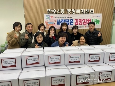 (중앙뉴스타임스 = 방재영 기자) 인천 남동구 만수4동 지역사회보장협의체는 소외된 이웃을 위한 ‘동절기 저소득 가구 사랑담은 김장 김치 나눔 사업’으로 김장 김치(890kg)를 지원했다고 21일 밝혔다.