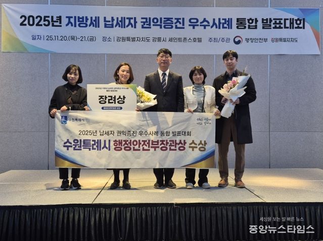 (중앙뉴스타임스 = 방재영 기자) 수원특례시가 행정안전부 주관으로 20~21일 강릉시 세인트존스호텔에서 열린 ‘2025년 납세자 권익 증진 우수사례 통합 발표대회’에서 장려상을 받았다.