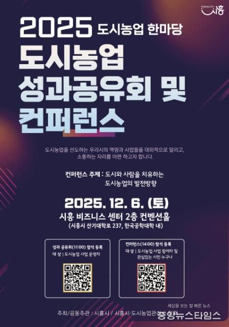 (중앙뉴스타임스 = 방재영 기자) 시흥시는 오는 12월 6일 한국공학대학교 내 시흥비즈니스센터 컨벤션홀에서 ‘2025년 도시농업 한마당 성과공유회 및 콘퍼런스’를 개최한다고 24일 밝혔다.
