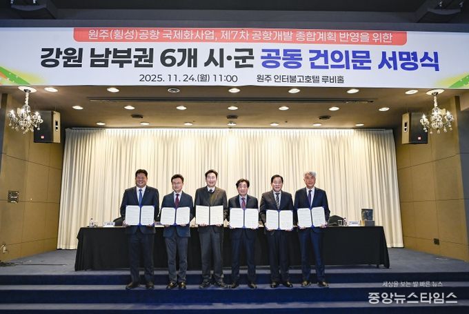 (중앙뉴스타임스 = 방재영 기자) 강원 남부권 6개 시군(원주·횡성·영월·평창·정선·태백)은 24일 오전 11시, 호텔인터불고 원주에서 국토교통부의 ‘제7차 공항개발 종합계획’에 ‘원주(횡성)공항의 국제화 사업 반영’을 요청하는 공동 건의문을 채택했다.