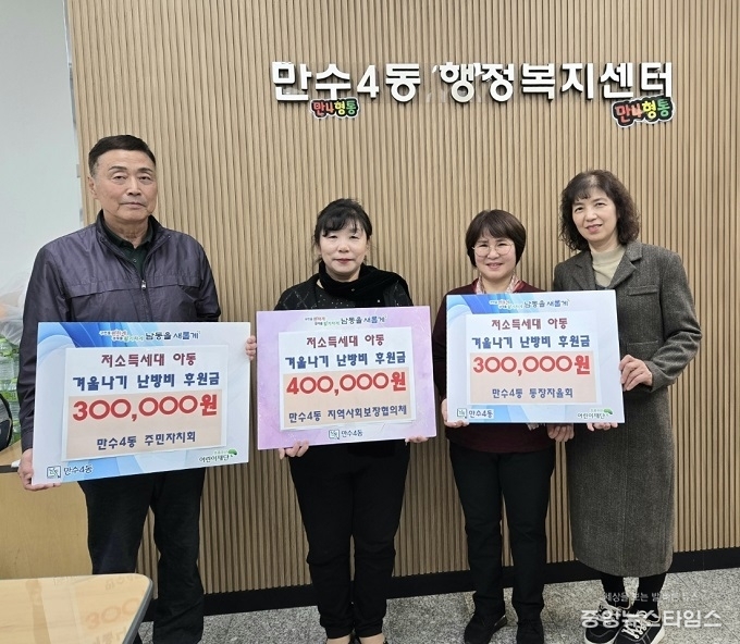 (중앙뉴스타임스 = 방재영 기자) 인천 남동구 만수4동 행정복지센터는 동 3개 자생 단체로부터 겨울철 난방비 부담으로 어려움을 겪고 있는 에너지 취약계층을 돕기 위해 후원금 100만 원을 전달받았다고 24일 밝혔다.
